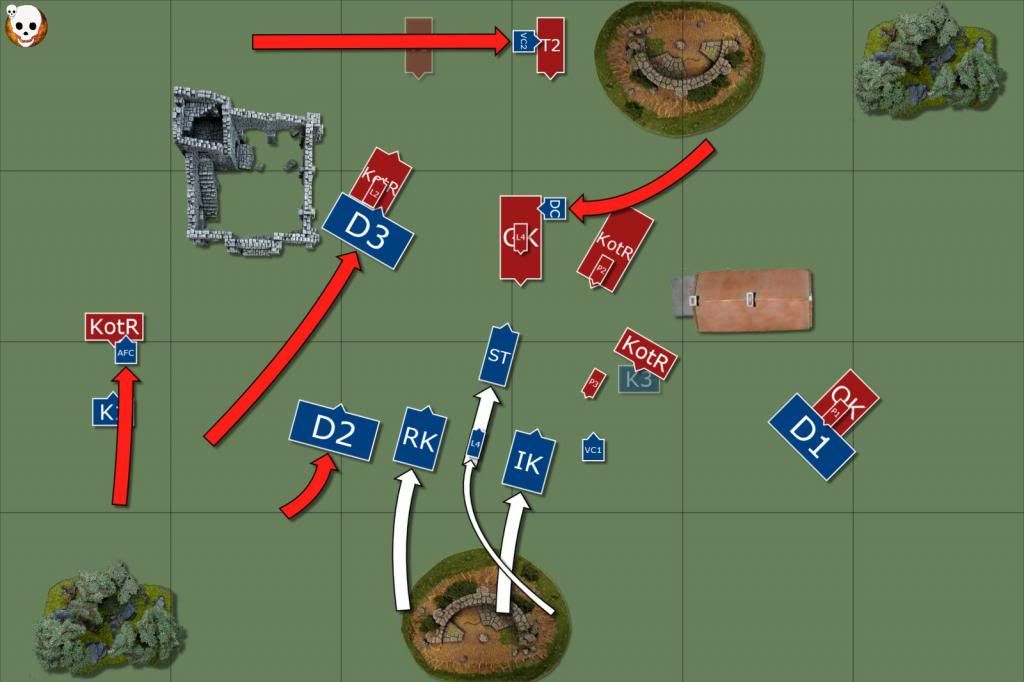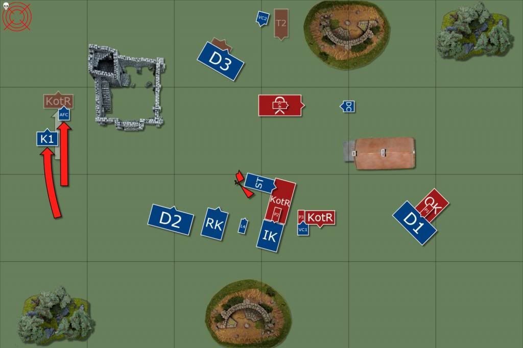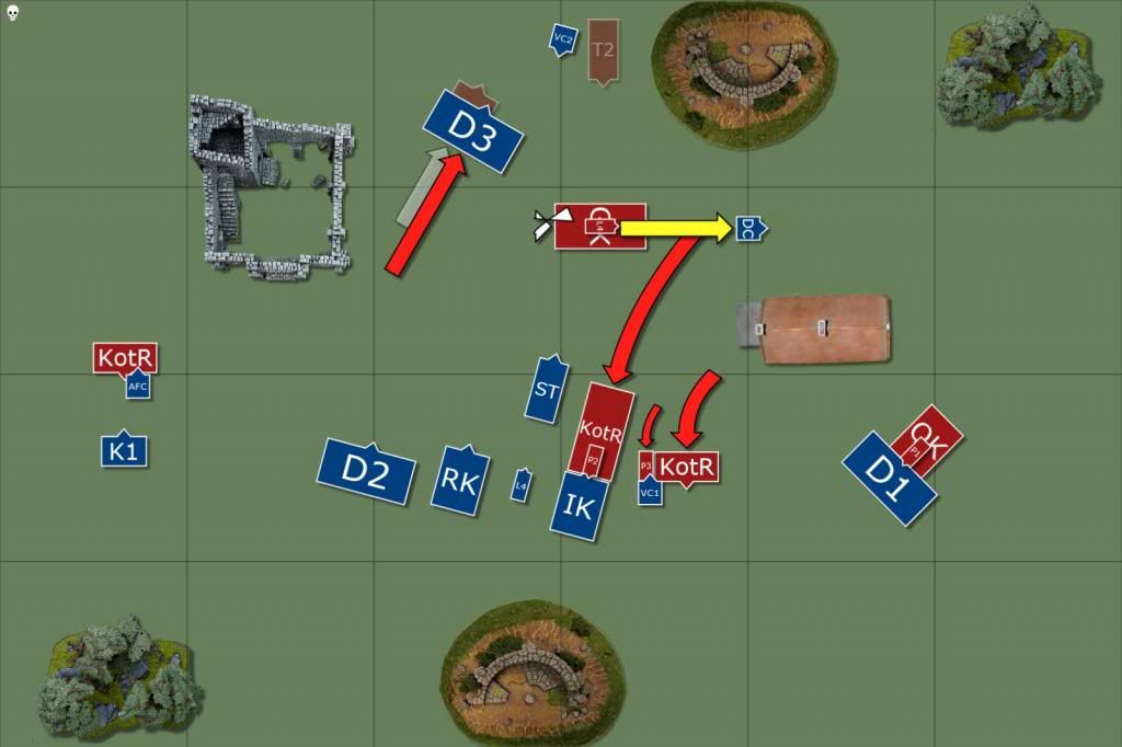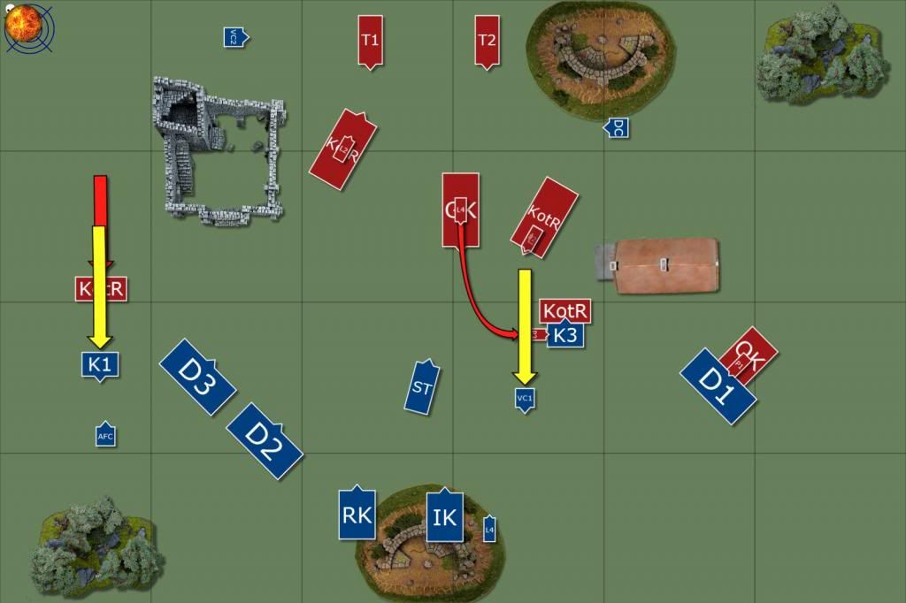 We knew we were going to have to stop, so it was mostly getting whatever points were left that could be gotten. Dropped HC on the Demis fighting the Questing Knights, just to keep them alive (I'd given up on that combat). Charges as you see them.