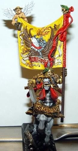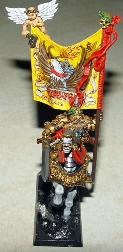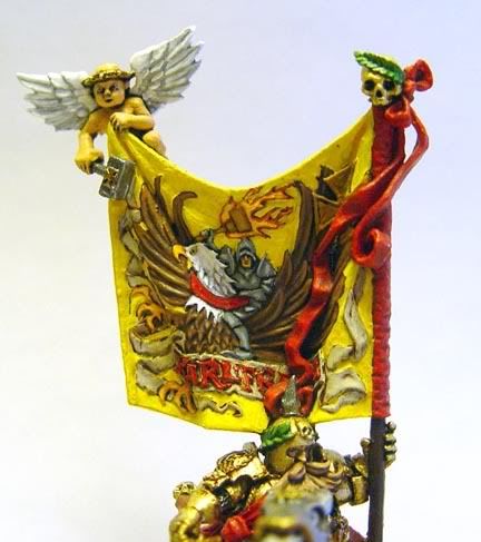 It's a cherub, not a robo-baby, like on the general's sprue. I have always felt that the cherub was a bad choice for this model. Cherubs are fine for 40k, but for fantasy it's a bit more than most people are willing to swallow. A removable cherub would have been nice (esp for 40k players), but Ludwigs banner would be difficult to adapt to a 40k piece.