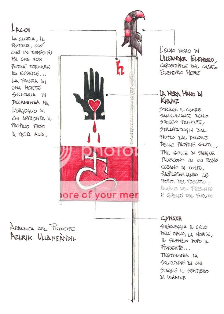 a black open hand on a white field, holding on the palm a bleeding heart. It's Prince Aelrik's own heart, teared off from his chest by his own cruel doings and the grief for his beloved ones deaths.