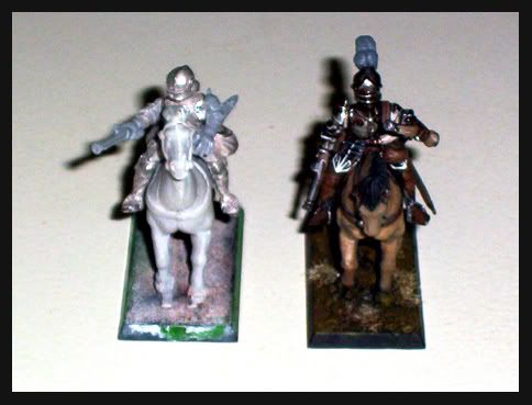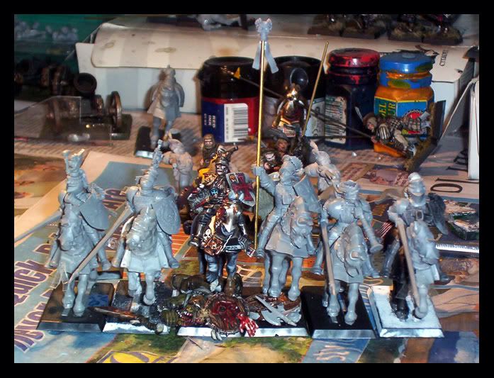 I'm reposting this picture of the Reiksguard, cos I adore them (two still need crests, and the Reiksmarshall needs his helmet wings). They look huge and intimidating and quite quite scary, which is not what I want when we're talking attracting shooting. They are unmistakably inner circle! Still, they will be a nice centrepiece. They also make my pistoliers look miniscule by comparison. Like, very small. I will deal with this issue later.
