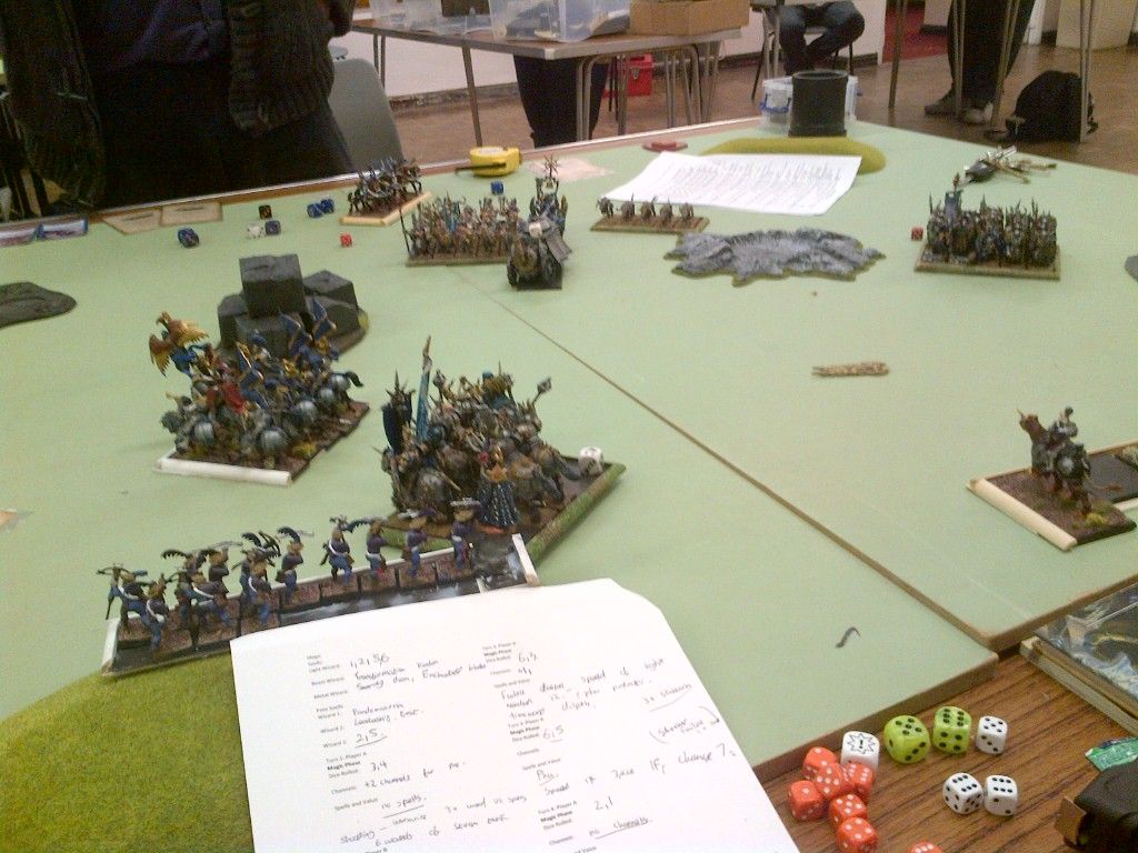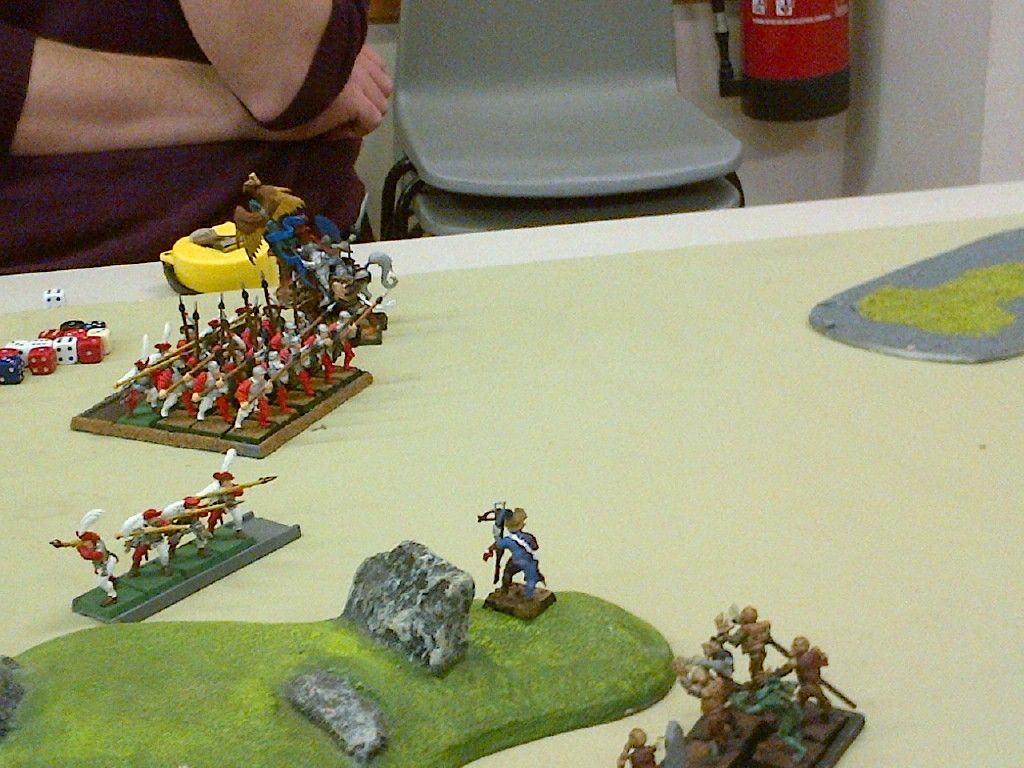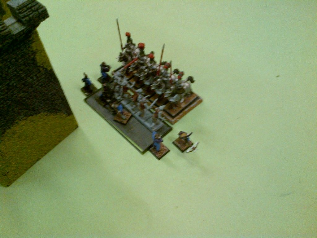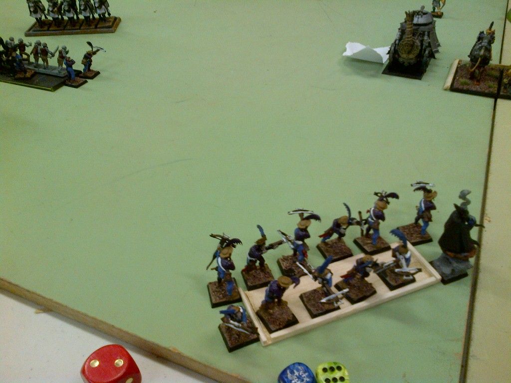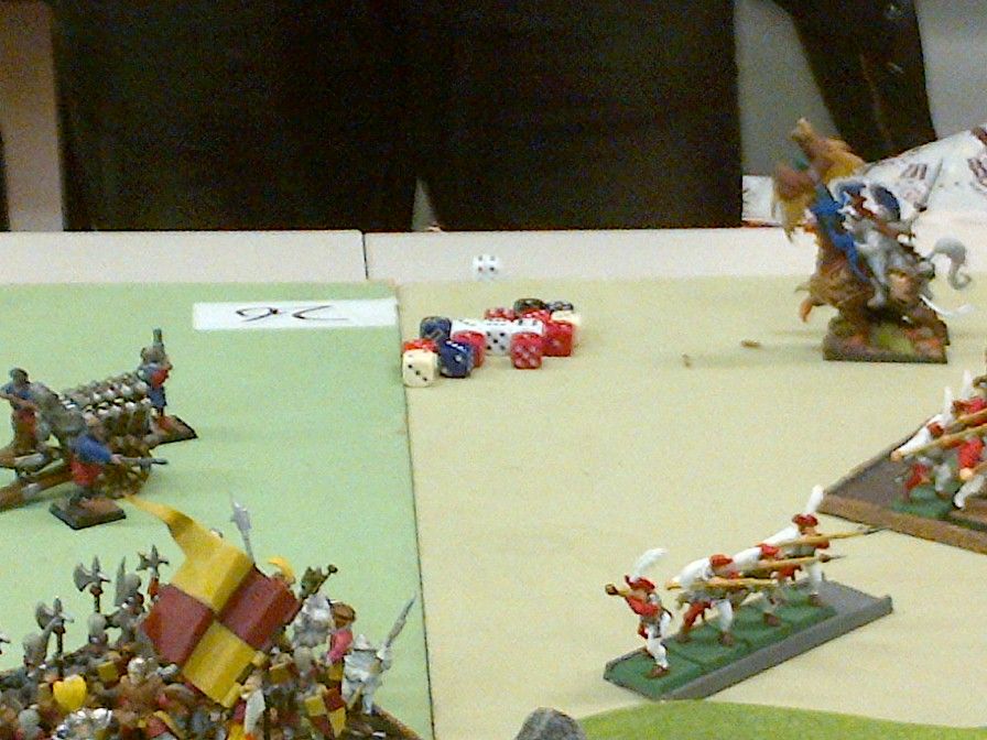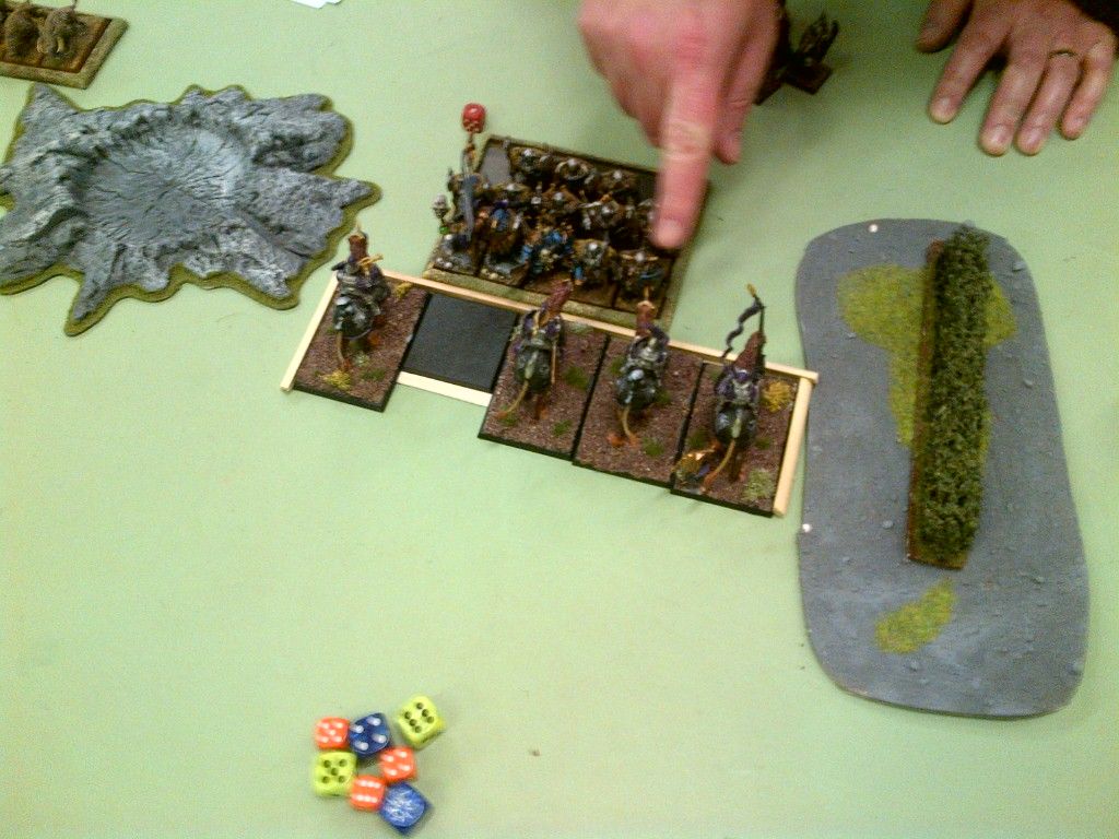 Knights into rear of chickens... i flee... dice on the table were 1, 6 with a dice spinning needed it less then 4 to be safe...... it was a 3 few whipes brow....