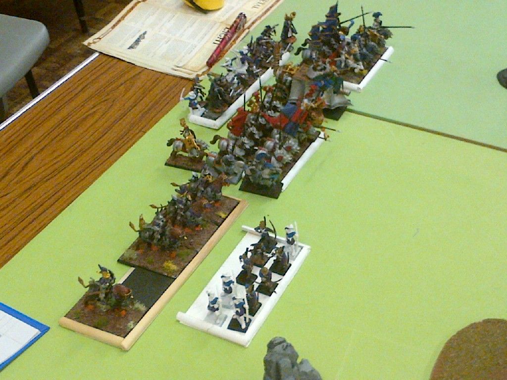 with the blue reiksguard knights behind, with the inner circle to the left of them in red.... the cannon is to the left of the hill..metal wizard is hid behind chickens, all other wizards went into the crossbows.