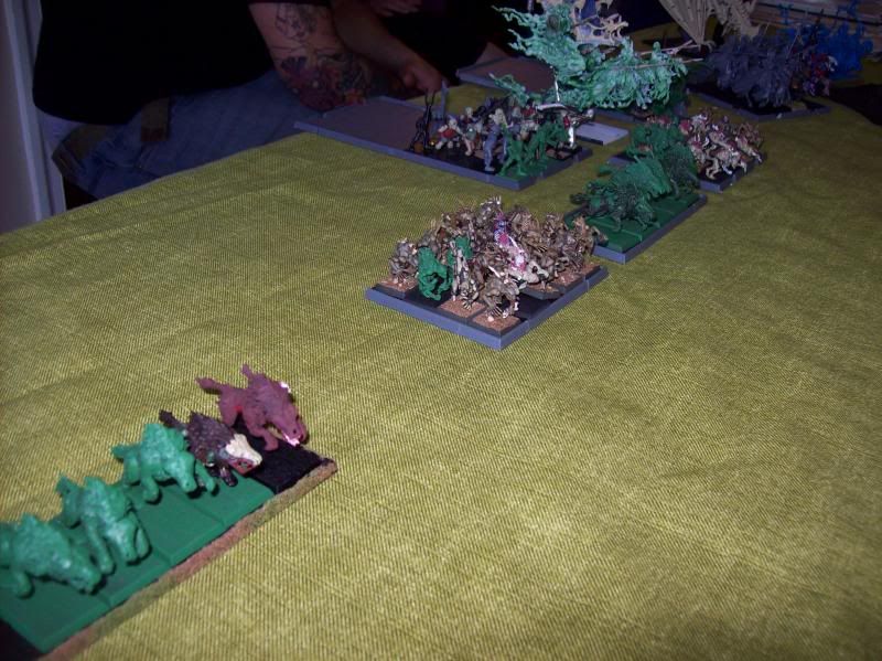 His set up was wolves-ghoul unit-more wolves-zombies-ME with ghoul unit in front-BK unit with TG behind and on his left flank the HW's.