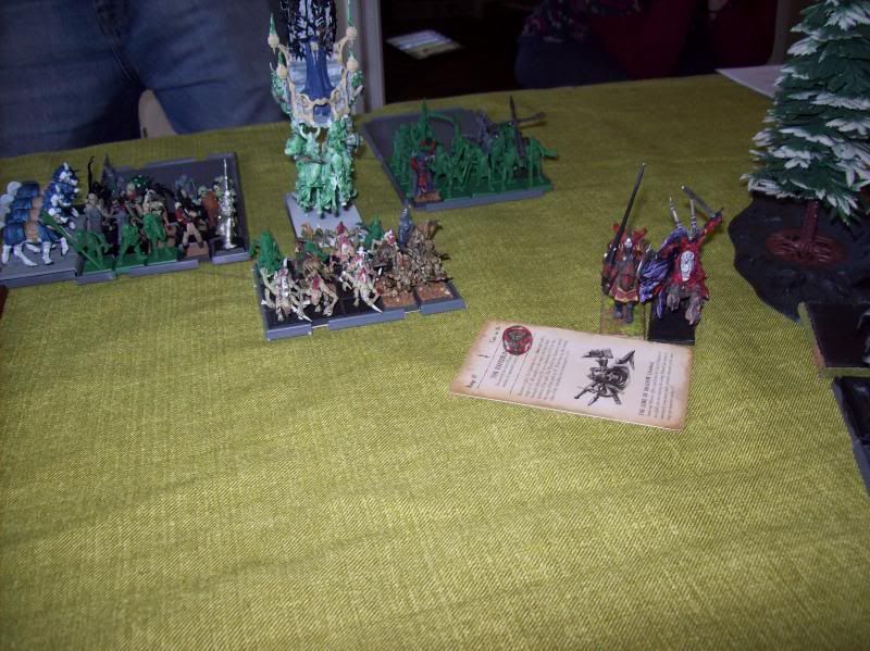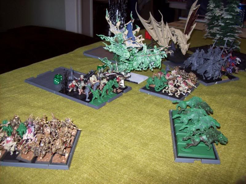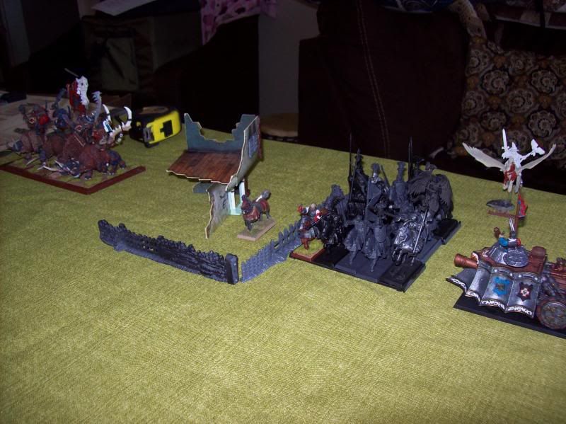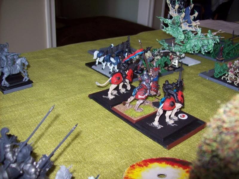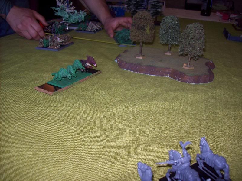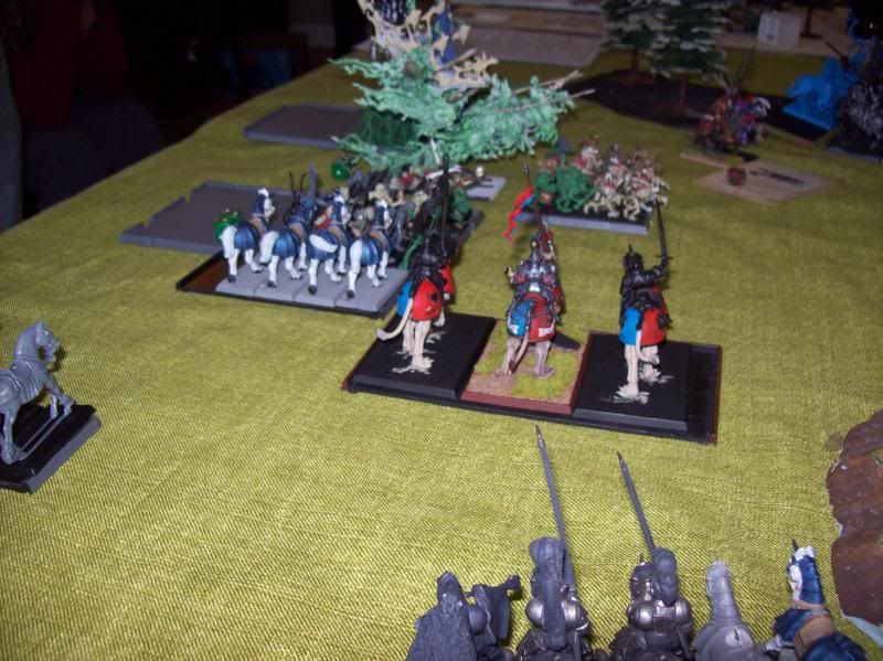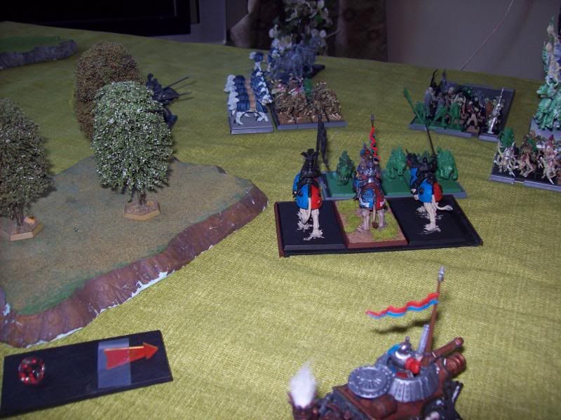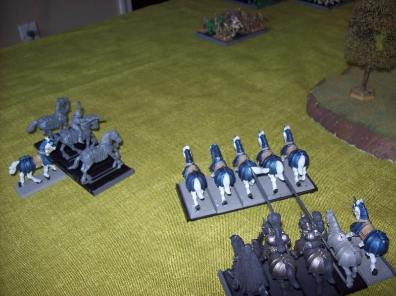 On his right flank he moved his ghould unit to face my 2 khight units and the pistoliers. The center units all moved up a little. he wasn't sure what I could do with Empire so he was playing a little cautious. His ME gave everybody a +6 regen and his TG a 5+ regen. His HW's moved up thru the forest to it's edge sticking a little out.