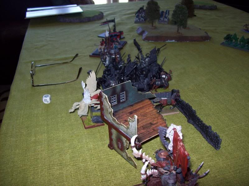 Combat saw my DGK going first and they had the flaming banner and tore thru the wolves and overran right into the next combat the the knights and ghouls who were going to fight!! So my DGK went first and negated their regen, killed some. My knights units failed their fear test and only killed a couple. He rolled crazy for poison and ended up causing 10 wounds out of 15 attacks on my knights. But I only failed 1. So I killed 9 ghouls and with CR he lost by 11. Wiped out the whole unit. Knights overran into the side of the zombie bunker and the DGK reformed facing the flank of the center ghoul unit. And my Cav vs his HW's he was able to kill 2 knights so I only won combat by 2 so cumbled 2 of them.