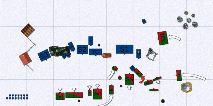 Empire Turn 1The steam tank generated 2 steam points and put them both into firing the cannon, which smashed through the bastilidon facing it. 1 down, 2 to go! The rest of the Empire line counted itself lucky that the Lizards had stayed put as much as they had and followed suit, though the volley gun did move up so it could be assured a shot next turn.