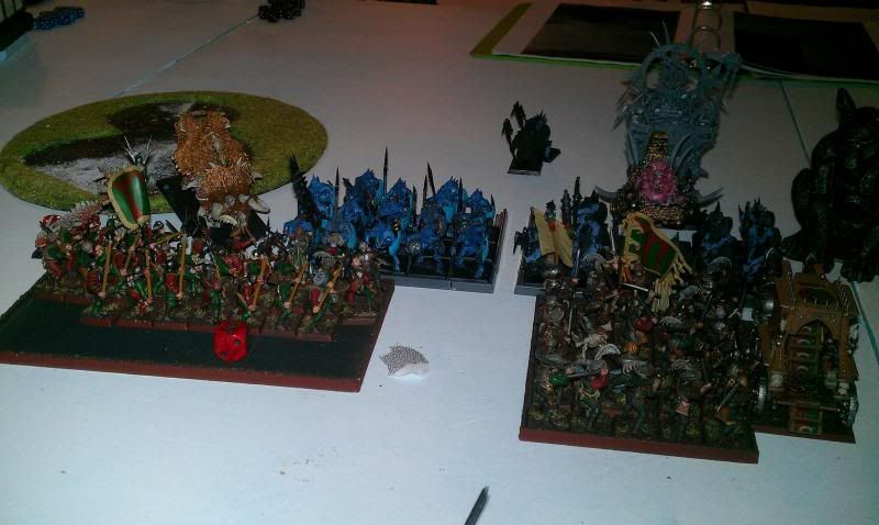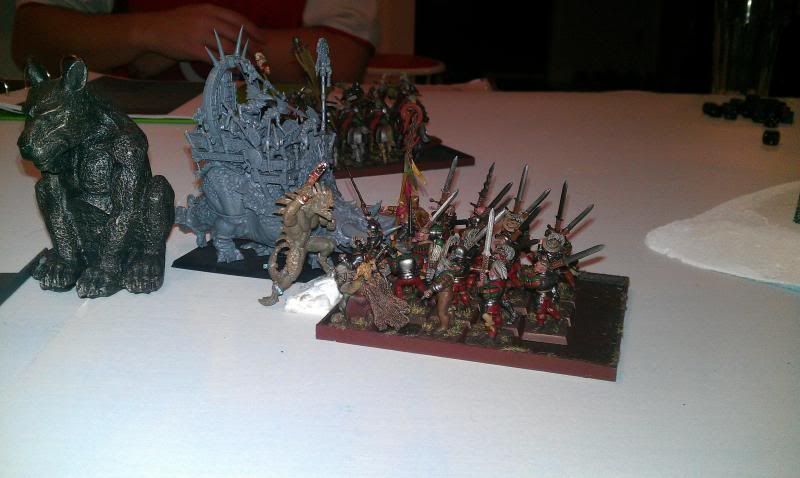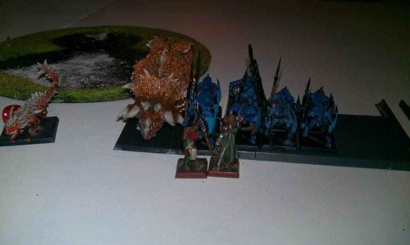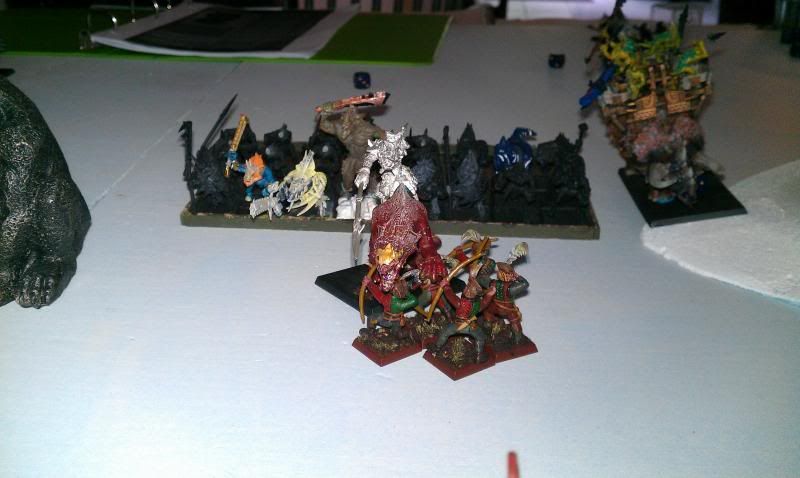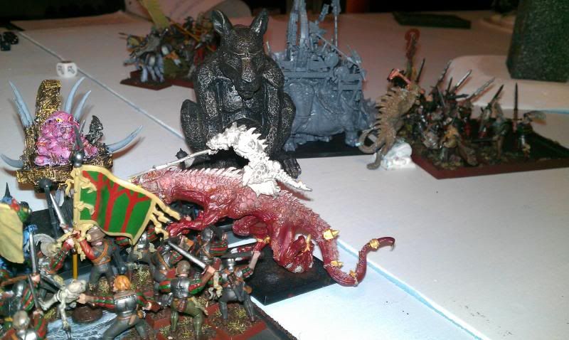 The pistoliers did have a tight charge on the chameleons that had got right up close to them and overran the skinks. Magic was 8-5. To try and get some chaos in the Lizard lines, the heavens wizard put all his power into a comet which focused right infront of the carnosaur. Alas, it was cast with irrisistable force and he blew all wizarding knowledge out of his head!