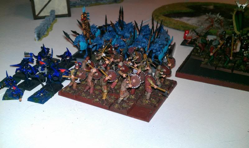 Lizard Turn 1The Lizardmen started very cautiously, only really pushing their flank units up whilst the Saurus centre stayed put. The ripperdactyls flew right up the board edge ready to charge in next turn.