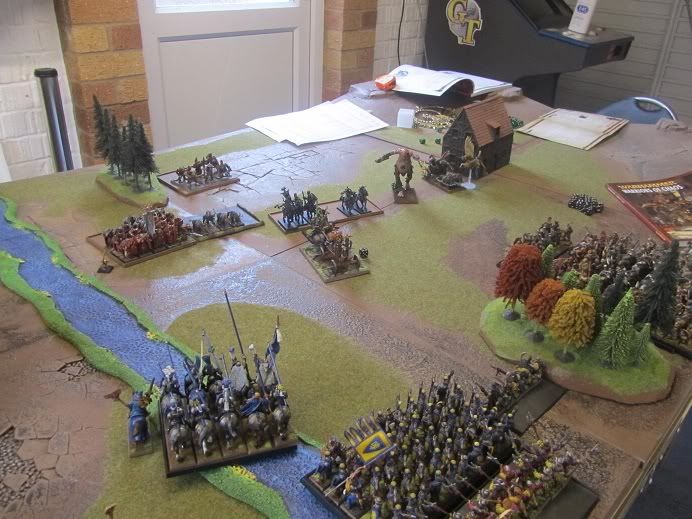 The Giant tore into the Xbows, who took two wounds from the beast, in a stand and shoot reaction. He clubbed them killing only 1 , but they failed their leadership test rolling a 9 and fled backwards into the Marauding horde, and were torn apart!!